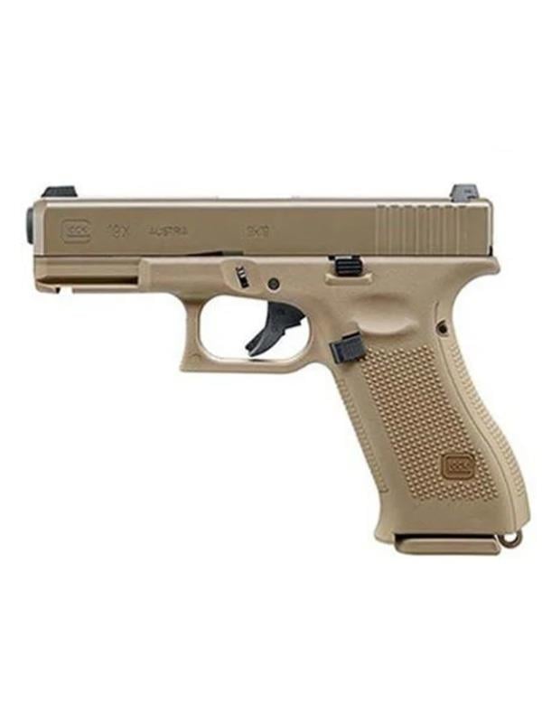 GLOCK, G19X'i ilk "çapraz tabanca" olarak tanımlıyor. Bu modelde; G17'nin tam boyutlu çerçevesi G19'un kompakt kızağıyla birleştirilmiştir. Özel FDE - Tan rengi kaplaması bu tabancayı diğer modellerden ayırır. Umarex'in bu lisanslı CO₂-powered hava tabancası , orijinalin tam boyutları ve özellikleriyle gerçek bir kopyadır. Maksimum 2 joule ile 4,5 mm çelik BB'leri ateşler. ve güçlü bir geri tepme sağlar. Hepsi bir arada şarjörü, kapsül ve 19 adet çelik BB'yi barındırır.